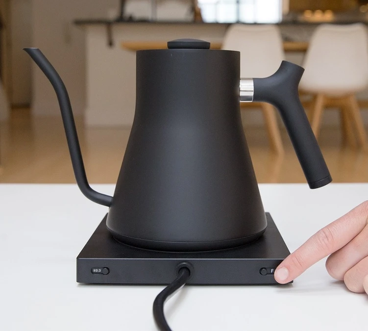 Un contrôle de la température très facile avec cette bouilloire Fellow en réalisant une simple pression sur un bouton sur la base de la bouilloire. Il suffit de tourner le cadran pour sélectionner la température souhaitée allant de 55°C et 100°C.